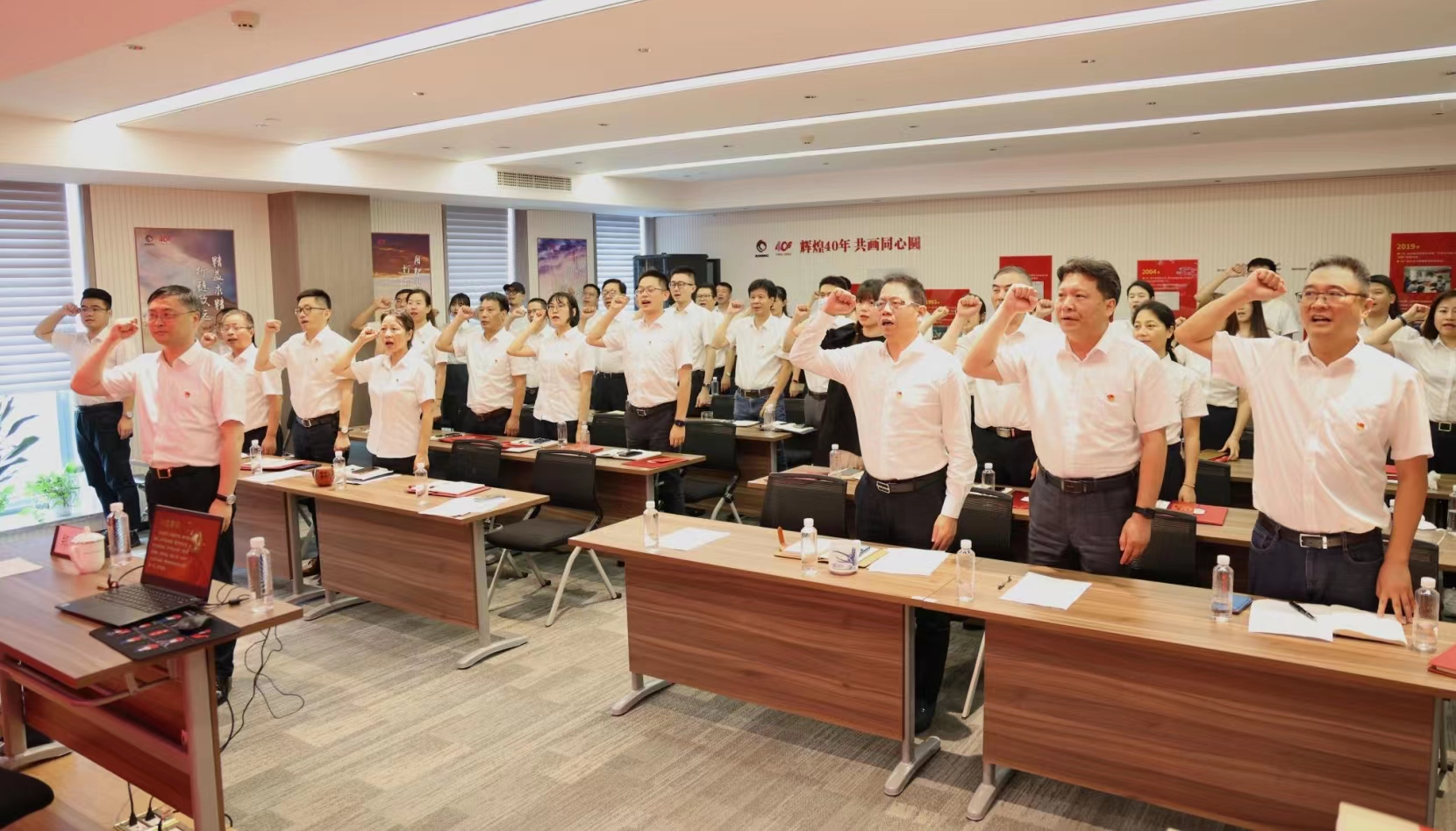 7月18日下午,浙江省冶金物資有限公司各黨支部圍繞“回顧光輝歷程,凝聚奮進(jìn)力量”召開主題黨日活動(dòng),專題學(xué)習(xí)省第十五次黨代會(huì)精神。杭鋼集團(tuán)黨委委員、副總經(jīng)理劉樹林出席會(huì)議并宣講浙江省第十五次黨代會(huì)精神,會(huì)議由公司黨委書記、董事長(zhǎng)鄭浩主持召開,冶金物資黨委委員、總經(jīng)理徐華金,黨委委員、紀(jì)委書記陳洪琳,黨委委員、副總經(jīng)理陳建,全體黨員及入黨積極分子等近60人參加會(huì)議。