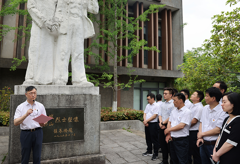 在沈干城、沈樂山烈士塑像前,鄭浩為大家講述了兩位烈士對(duì)杭州工人運(yùn)動(dòng)的偉大貢獻(xiàn),回顧了馬克思主義在杭州的傳播與影響,并帶領(lǐng)大家重溫了入黨誓詞。